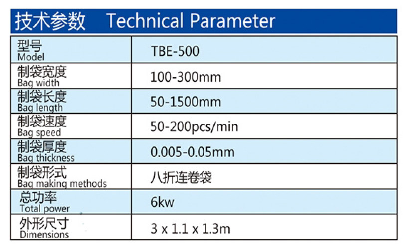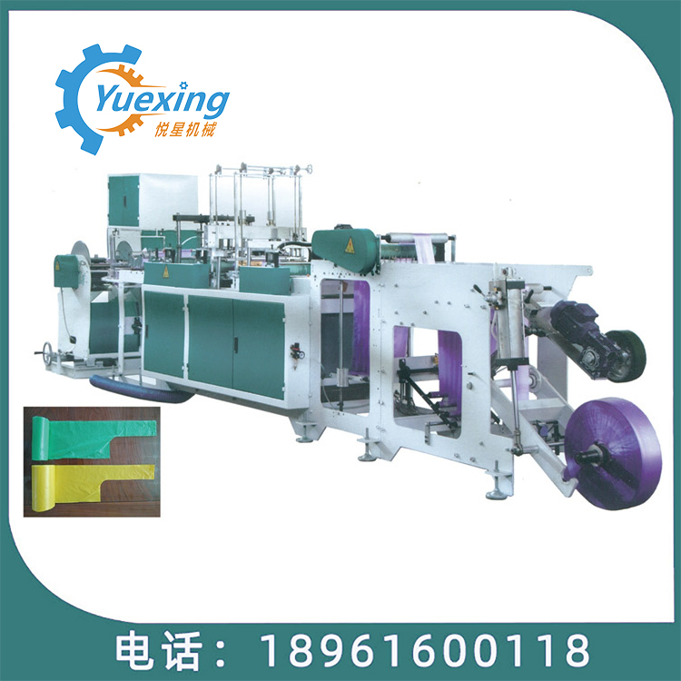 機器特性 此設備為生產連卷八折背心垃圾袋的專用設備,單通道高速無拉伸,操作簡單,底封好,收卷整齊,個數準確,手動收卷。 此設備采用全鋼板一體而成,用電220V照明電即可。
