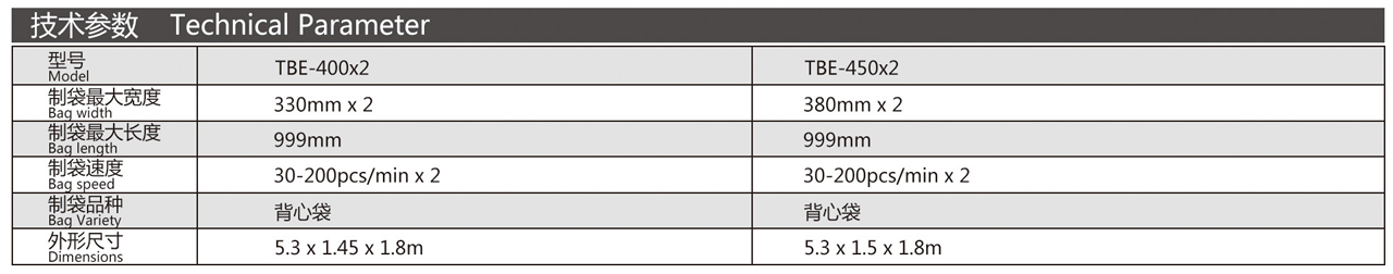 機器特性 該機適用于對高密度聚乙烯(HDPE),低密度聚乙烯(LDPE)簡狀本色和彩印塑料薄膜進行熱封熱切制袋,雙刀雙道生產線,配備機械手自動沖,從送料、封底、切斷、沖口折袋、輸送一次性